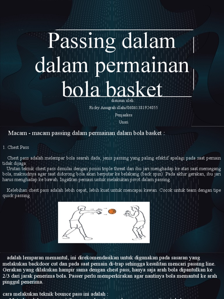 Passing passing dalam permainan bola basket artinya. The under hand pass : Pengertian passing secara umum dalam olahraga bola basket adalah mengumpan atau mengoper bola ke teman setim. A.the two hand ckest pass : Passing atas normal bola berada di depan atas muka sedangkan passing atas setinggi muka pada saat perkenaan bola berada tepat di depan muka.